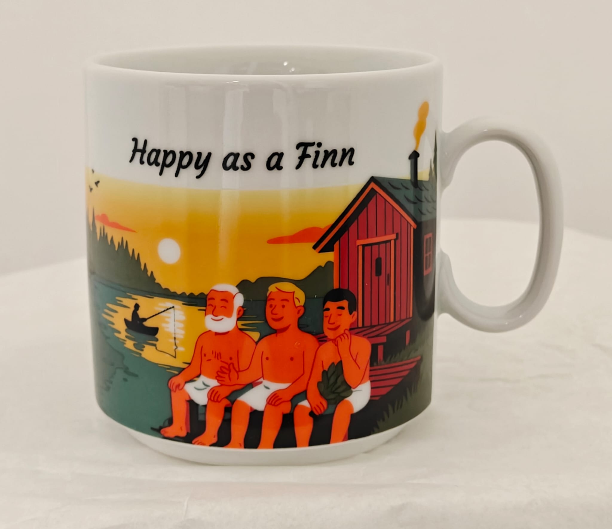 A high-quality ceramic mug depicts a happy Finn in their traditional habitat, in front of a sauna by a lake, as the sun is setting in the background.