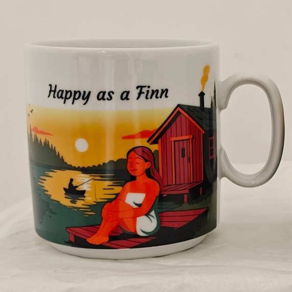 A high-quality ceramic mug depicts a happy Finn in their traditional habitat, in front of a sauna by a lake, as the sun is setting in the background.
